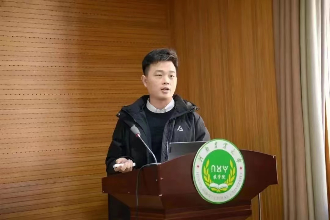 在研究生代表向闫鹏帅献花后,闫鹏帅结合自身科研经历、科研思路、科研进展进行学术汇报并分享了自己的成功经验。他表示缺铁性贫血是全球第五大高发疾病,我国居民膳食来源普遍铁含量不足,缺铁性贫血人数超过10%,在日常生活中如何“补铁”至关重要。闫鹏帅结合“铁生物强化”研究现状及玉米食用方式的多样化,最终将玉米“铁生物强化”作为研究课题。闫鹏帅说在实验过程中,玉米“铁生物强化”研究主要有以下两个难点:一是玉米基因组复杂,玉米籽粒铁含量是微效多基因控制的性状;二是该性状候选基因的挖掘依赖于定位群体结构。为了产出突破性品种,他不断尝试,吸取他人长处、经验和教训,最终才得以做出高质量科研成果。闫鹏帅的分享让在场学生深受启发和鼓舞。随后他与大家进行了互动交流,“学长是如何协调科研和生活?”“如何缓解自身压力?”“是否担心最终无法做出成果?”面对学弟学妹们的问题,闫鹏帅积极解答,耐心引导。