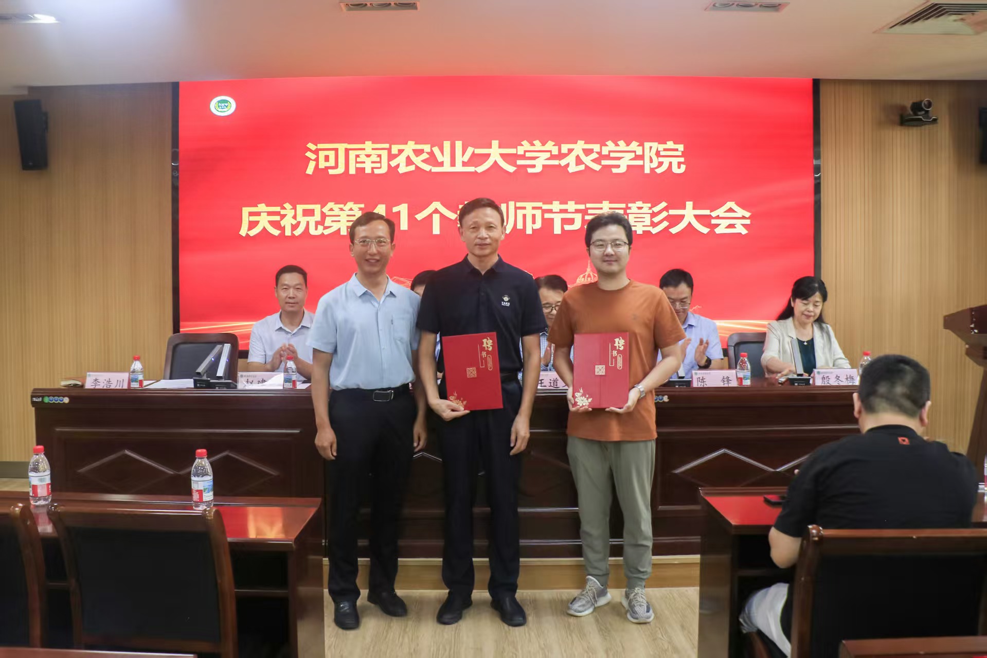 表彰环节结束后,优秀教师代表唐建卫上台发言。他结合自身小麦遗传育种工作,分享2019年加入草榴后科研与育人的经历,以及田间带教、关怀学生的体会,彰显对农教事业的热爱与坚守。