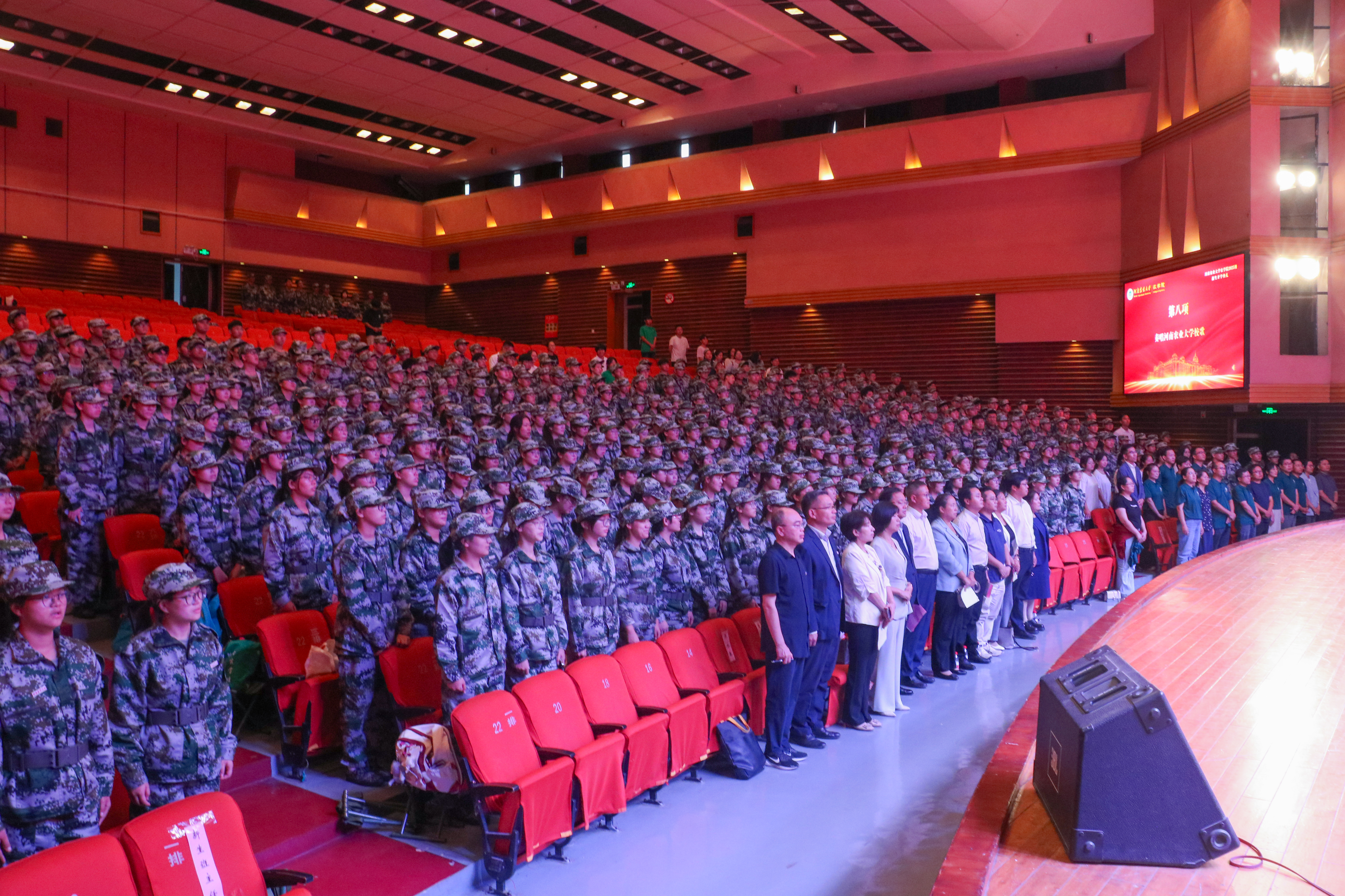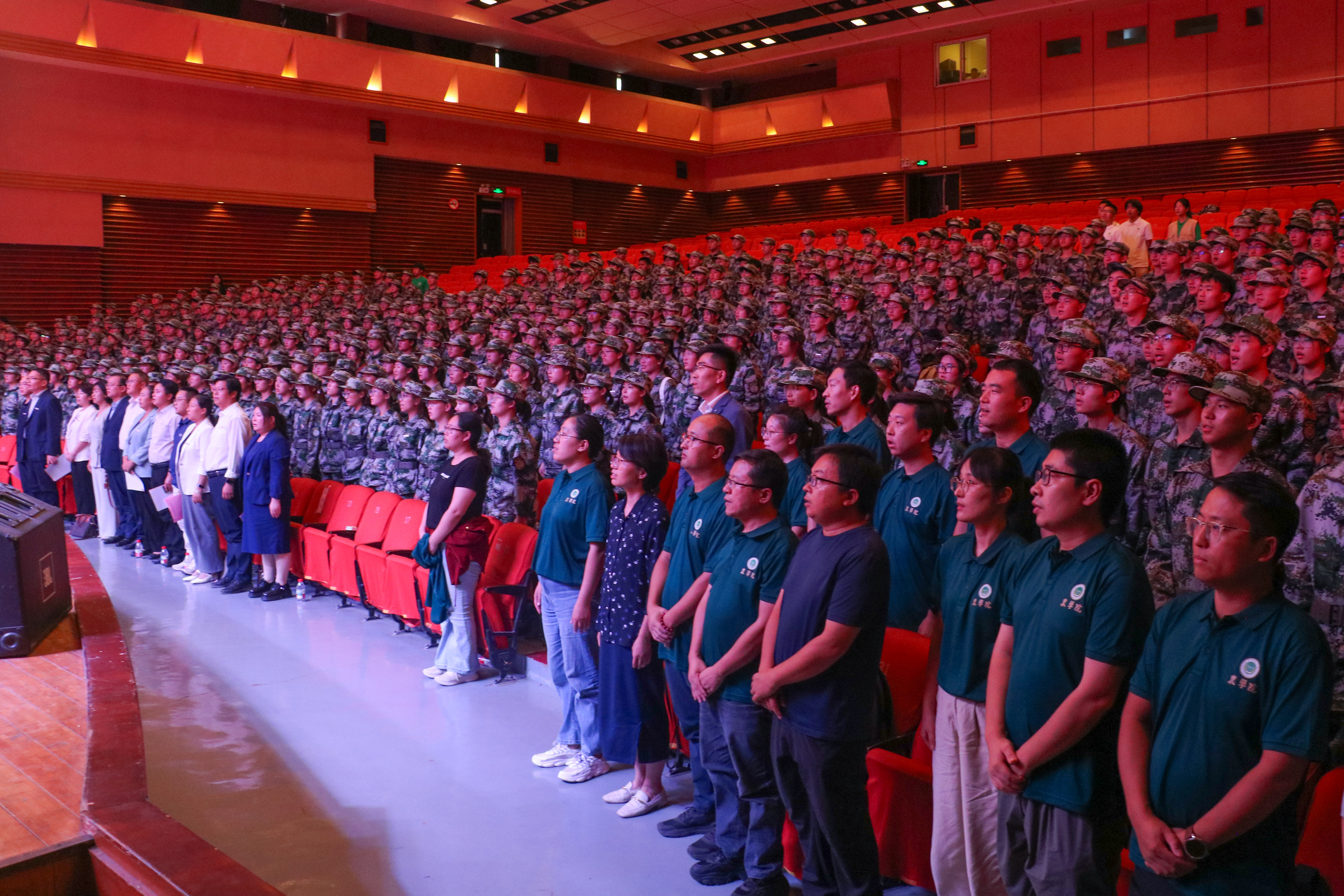 典礼在庄严的国歌声中拉开帷幕,全体人员肃立高唱,爱国情怀与青春朝气在会场中激荡。