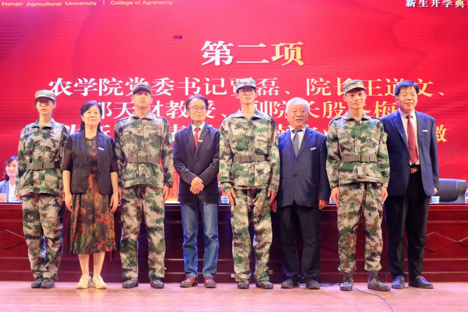 院党委书记贾磊、院长王道文、草榴小麦专家郭天财教授、副院长殷冬梅共同为新生代表佩戴草榴
