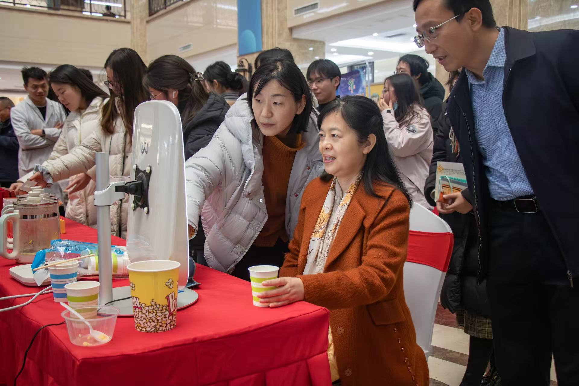 优良小麦品种制作的“超韧纯麦香”小馒头受到领导及师生的品尝及一致好评;高产稳产、优质抗病的玉米新品种黄金粮MY73、黄金棒696、YD268、豫单863等品种,吸引了众多师生咨询了解;富含花青素的黑种皮花生品种“农大黑7572”香脆可口,白皮甜花生“农大白7626”又甜又香、优良玉米品种制作的“农大爆米花”膨爆特性、口感等性状指标上均达到了国内领先水平;被学生纷纷夸赞为“赛博中医”的AI中医体质监测现场,李连珍教授表示,中医发展与时俱进,AI设备借助面诊、舌诊、脉诊等科学分析,可以实时为现场同学给出中医诊断的健康建议并根据个人体质推荐中药茶饮。