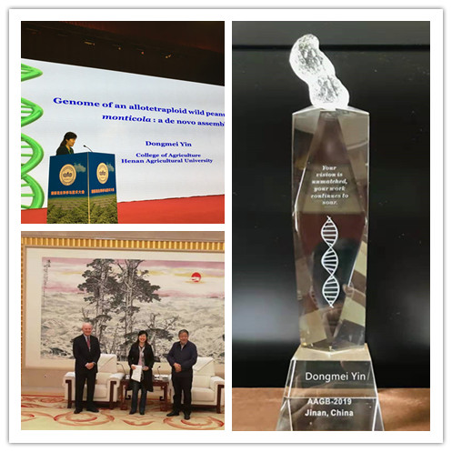 该基因组的公布对于研究祖先二倍体花生与栽培四倍体花生的起源、进化起到了“桥梁”的作用,对于理解花生属和豆科作物进化具有重要的科学价值,有力促进了花生以及其他油料作物的功能基因组学发展和分子育种。为表彰殷冬梅教授在花生基因组方面的突出贡献,组委会和美国花生委员会授予殷冬梅教授杰出贡献奖,奖杯上颁奖词——“Your vision is unmatched, your work continues to soar”。(文/马兴立)